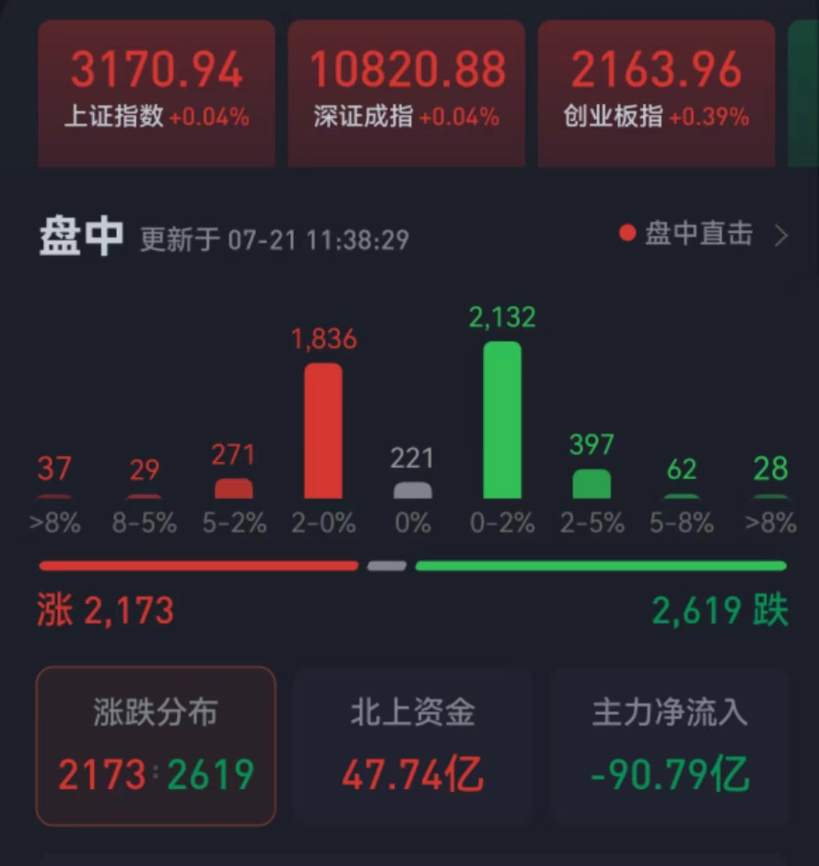 周五(7月21日),三大股指震蕩攀升,全線翻紅。截至上午收盤,上證指數(shù)微漲0.04%,報(bào)3170.94點(diǎn);深證成指和創(chuàng)業(yè)板指分別漲0.04%和0.39%;滬深兩市合計(jì)成交額4350.1億元,總體來看,兩市個(gè)股跌多漲少。
