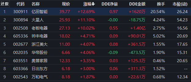 從早盤表現(xiàn)強(qiáng)勢的廚衛(wèi)電器行業(yè)看,交易中的9只成份股全線上漲,其中,有3只個股漲幅超5%。