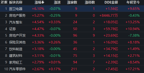 同花順行業(yè)方面,截至7月25日11:30,76個行業(yè)板塊中有72個上漲,占比94.74%,其中,廚衛(wèi)電器行業(yè)漲幅居前,達(dá)6.10%,此外,房地產(chǎn)服務(wù)、汽車整車、證券和房地產(chǎn)開發(fā)等行業(yè)漲幅均超4%。下跌方面,中藥板塊居首,跌幅達(dá)0.22%。從資金流向的行業(yè)看,有48個行業(yè)大單資金凈流入,其中,證券板塊居首,凈流入額達(dá)59.78億元,此外,包括飲料制造、房地產(chǎn)開發(fā)和汽車整車等在內(nèi)的10個行業(yè)大單凈流入額均超10億元。