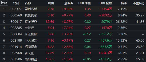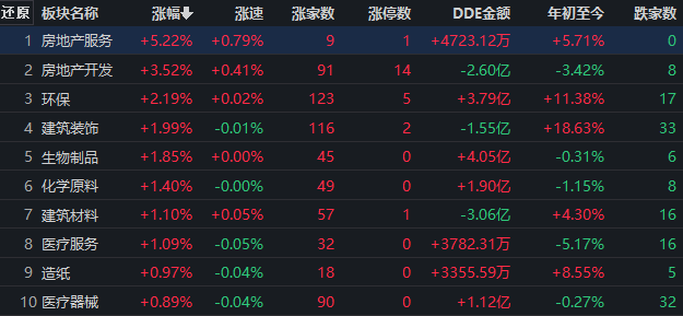從早盤表現(xiàn)強(qiáng)勢的房地產(chǎn)服務(wù)行業(yè)看,交易中的9只成份股全線上漲,其中,有4只個股漲幅超5%。