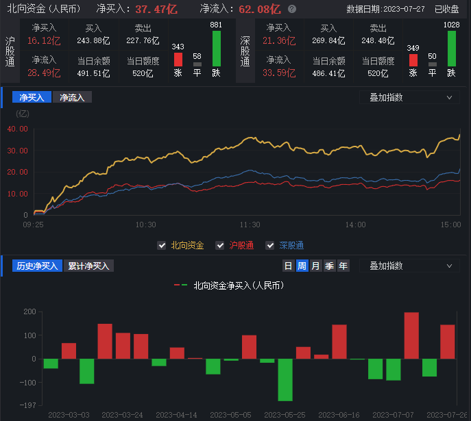 7月27日,A股三大指數(shù)震蕩回落。個股跌多漲少,量能相對平穩(wěn),北向資金凈買入逾37億元。有樂觀的機構分析人士表示,政策底明朗,市場也給出了正反饋,表明當前市場已經(jīng)處于底部區(qū)域。