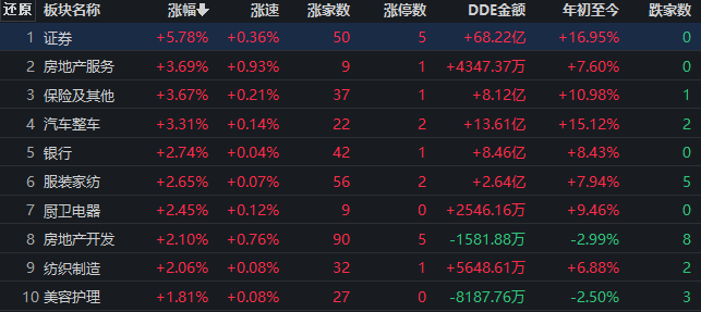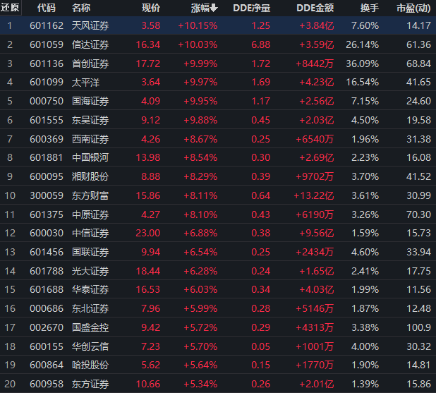 從早盤表現(xiàn)強(qiáng)勢(shì)的證券行業(yè)看,交易中的50只成份股全線上漲,其中,有5只個(gè)股漲停,另有18只漲幅超5%。
