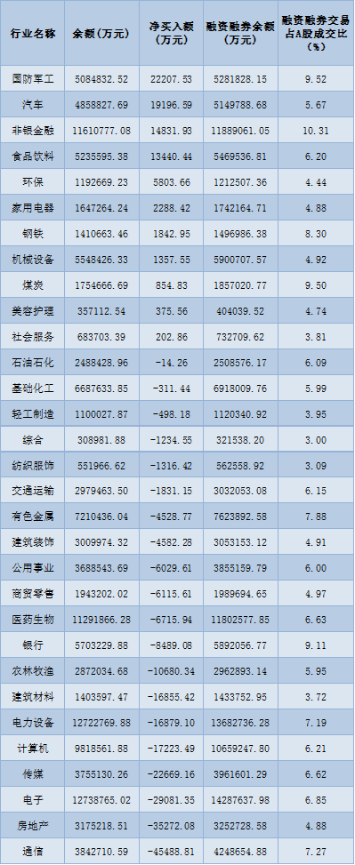 表:7月27日申萬(wàn)一級(jí)行業(yè)兩融交易情況