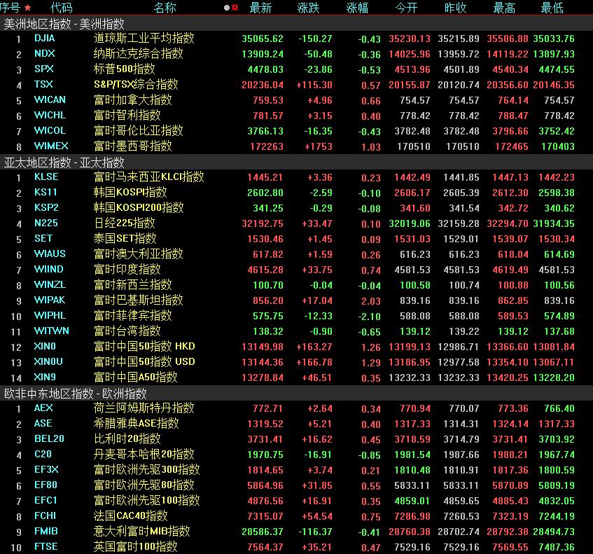 周五,美國三大股指全線收跌,道指跌0.43%報35065.62點,標普500指數(shù)跌0.53%報4478.03點,納指跌0.36%報13909.24點。本周,道指跌1.11%,標普500指數(shù)跌2.27%,納指跌2.85%。
