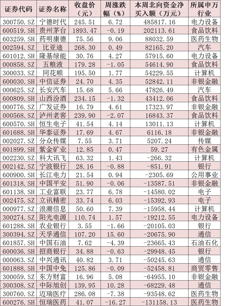 資金方面,本周北向資金累計凈買入金額達124.67億元,連續(xù)兩周實現(xiàn)凈買入。從前十大成交活躍股來看,寧德時代、貴州茅臺等2只個股北向資金凈買入金額均超20億元。另外,恒瑞醫(yī)藥、邁瑞醫(yī)療等個股遭北向資金凈賣出金額均超9億元。
