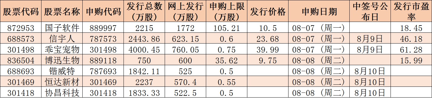 根據(jù)發(fā)行安排,下周(8月7日-11日)有7只新股發(fā)行,其中,創(chuàng)業(yè)板3只,科創(chuàng)板2只,北交所2只。具體安排如下,8月7日發(fā)行的是信宇人、乖寶寵物、國子軟件;8月8日發(fā)行的是協(xié)昌科技、鍇威特、恒達新材、博迅生物。
