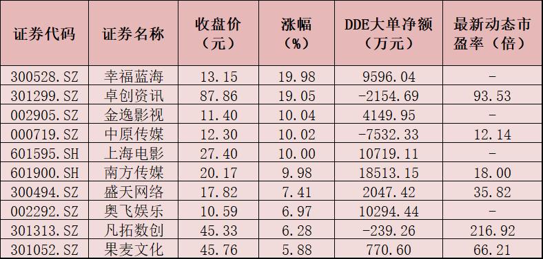 表:8月7日漲幅居前十的傳媒概念股一覽