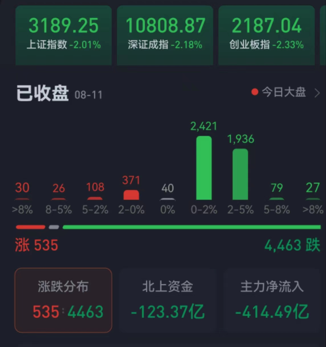 周五(8月11日),A股三大股指震蕩下行,全線飄綠。截至收盤,上證指數(shù)跌2.01%報(bào)3189.25點(diǎn),深證成指跌2.18%報(bào)10808.87點(diǎn),創(chuàng)業(yè)板指跌2.33%報(bào)2187.04點(diǎn),兩市合計(jì)成交金額達(dá)7634.91億元,北向資金凈賣出額達(dá)123.37億元??傮w上看,兩市個(gè)股跌多漲少,超4400只個(gè)股下跌。其中,漲停個(gè)股達(dá)26只,跌停個(gè)股達(dá)4只。進(jìn)一步看,在今日26只漲停股中,有10只醫(yī)藥股,5只地產(chǎn)股。