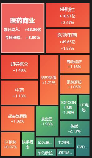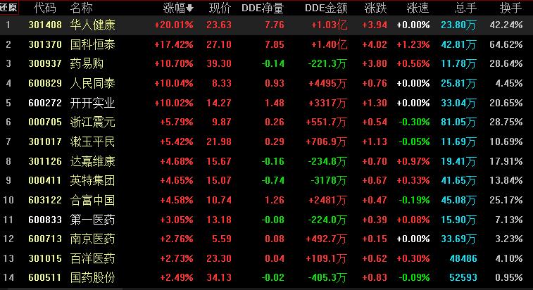 具體看,截至8月15日上午收盤,醫(yī)藥商業(yè)板塊逆市崛起,漲幅居首達3.80%,資金凈流入48.56億元。其中,華人健康20CM漲停、國科恒泰、藥易購、人民同泰、開開實業(yè)等概念股漲幅均超10%。