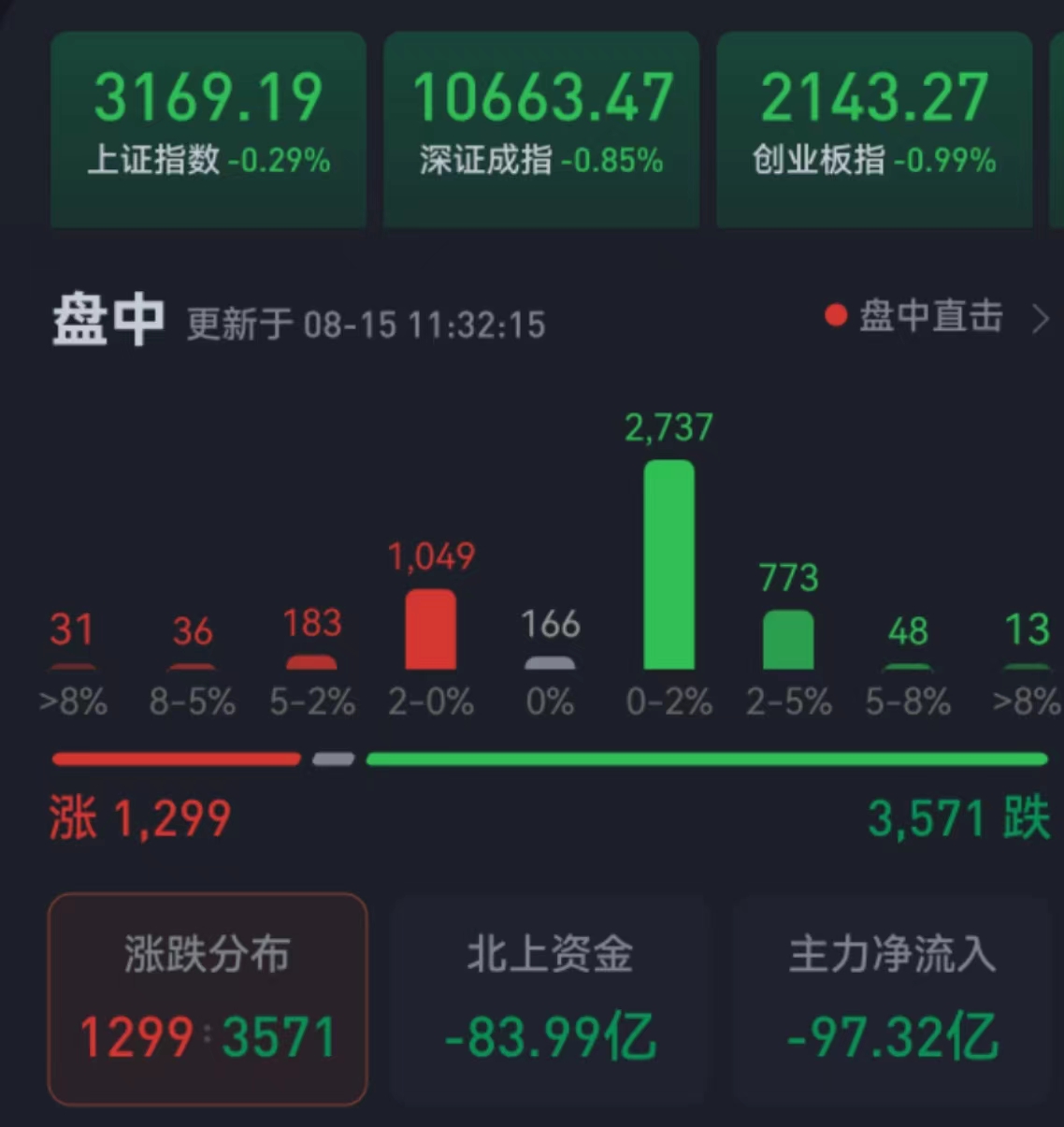 周二(8月15日),三大股指繼續(xù)震蕩整理。截至上午收盤,上證指數(shù)跌幅達0.29%,報3169.19點;深證成指和創(chuàng)業(yè)板指跌幅分別為0.85%和0.99%;滬深兩市合計成交額4276.9億元,總體來看,兩市個股跌多漲少,下跌個股近3600只。