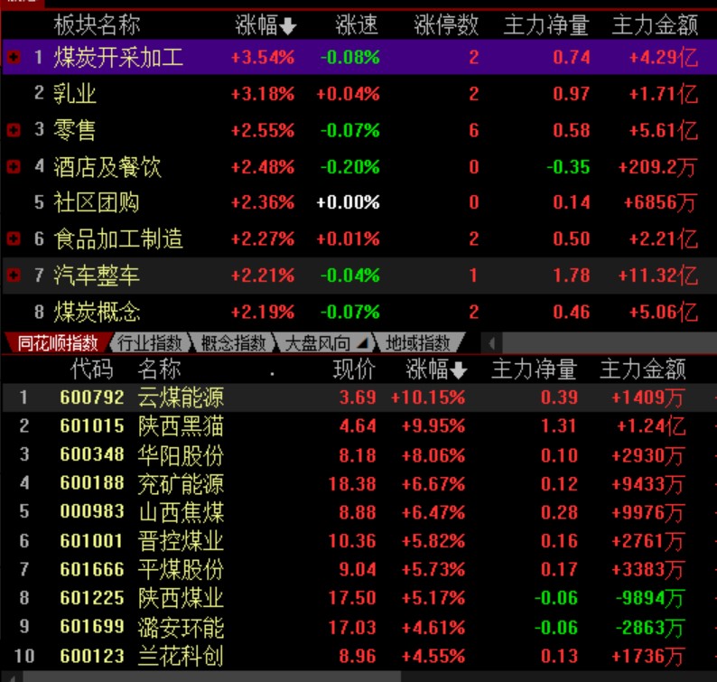 具體看,截至9月1日上午收盤(pán),煤炭開(kāi)采加工板塊表現(xiàn)搶眼,漲幅達(dá)3.54%。其中,云煤能源和陜西黑貓強(qiáng)勢(shì)漲停。