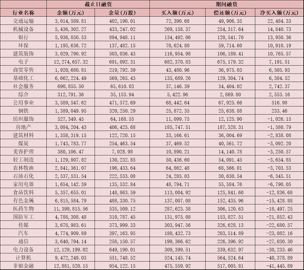 表:8月31日申萬(wàn)一級(jí)行業(yè)兩融交易情況