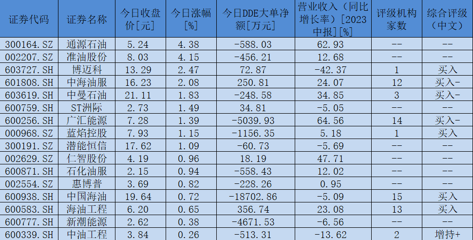 表:9月6日,油氣開采及服務板塊實現上漲個股一覽
