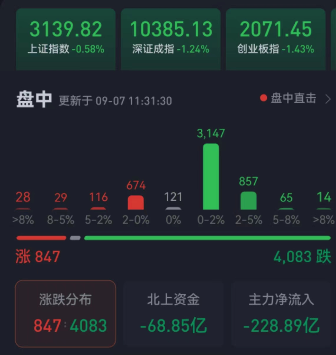 周四(9月7日),三大股指震蕩調(diào)整,繼續(xù)回落。截至上午收盤,上證指數(shù)跌幅達(dá)0.58%,報(bào)3139.82點(diǎn);深證成指和創(chuàng)業(yè)板指跌幅分別為1.24%和1.43%;滬深兩市合計(jì)成交額4759.5億元,總體來(lái)看,兩市個(gè)股跌多漲少,超4000只個(gè)股下跌。