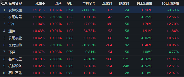 9月12日,下跌行業(yè)多于上漲行業(yè)。從31類申萬一級(jí)行業(yè)看,有10類行業(yè)上漲,21類行業(yè)下跌。上漲方面,農(nóng)林牧漁行業(yè)居首,漲幅達(dá)1.31%,家用電器、汽車行業(yè)也緊隨其后,漲幅均超1%。下跌方面,傳媒居首,跌幅為1.53%,非銀金融也跌超1%。