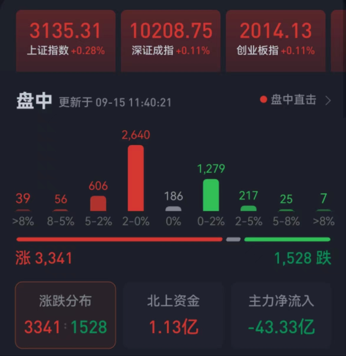 周五(9月15日),三大股指震蕩攀升,全線飄紅。截至上午收盤,上證指數(shù)漲0.28%,報(bào)3135.31點(diǎn);深證成指和創(chuàng)業(yè)板指均漲0.11%;滬深兩市合計(jì)成交額4356.3億元,總體來看,兩市個(gè)股漲多跌少,超3300只個(gè)股實(shí)現(xiàn)上漲。漲停個(gè)股達(dá)32只,跌停個(gè)股無。