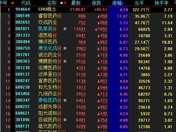 具體看,截至9月15日上午收盤,CRO概念板塊漲幅居首,達(dá)4.14%。其中,雙成藥業(yè)漲停,睿智醫(yī)藥漲幅均超10%。