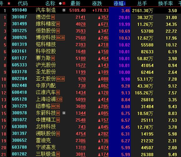 具體看,截至9月18日上午收盤(pán),汽車制造板塊強(qiáng)勁上揚(yáng),漲幅居首達(dá)3.46%,多只概念股集體漲停,上演“漲停潮”。其中,德邁仕和維科精密“20cm”漲停,恒勃股份和博俊科技等概念股漲幅均超10%。銘科精技、科華控股、賽力斯、滬光股份、圣龍股份、亞太股份等概念股紛紛漲停。