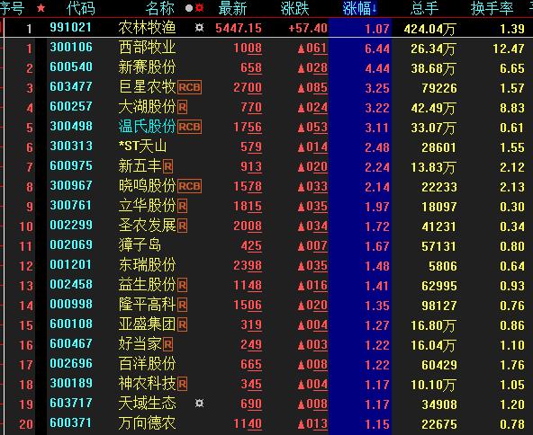 具體看,截至9月20日上午收盤,農(nóng)林牧漁板塊漲幅居首,達(dá)1.07%。其中,西部牧業(yè)、新賽股份等概念股漲幅均超4%。