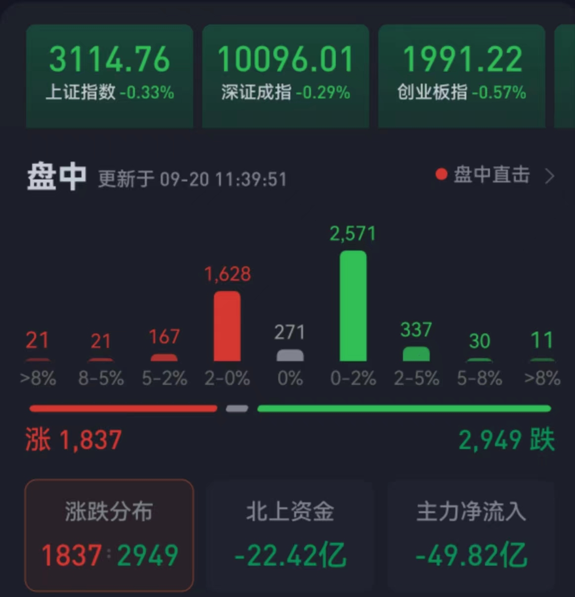 周三(9月20日),三大股指繼續(xù)震蕩整理。截至上午收盤,上證指數(shù)跌幅達(dá)0.33%,報3114.76點;深證成指和創(chuàng)業(yè)板指跌幅分別為0.29%和0.57%,創(chuàng)業(yè)板指失守2000點整數(shù)關(guān)口;滬深兩市合計成交額3469.8億元,總體來看,兩市個股跌多漲少,近3000只個股下跌。漲停個股達(dá)28只,跌停個股達(dá)5只。