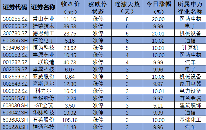 表:連續(xù)上漲3日且今日收盤漲停個(gè)股情況