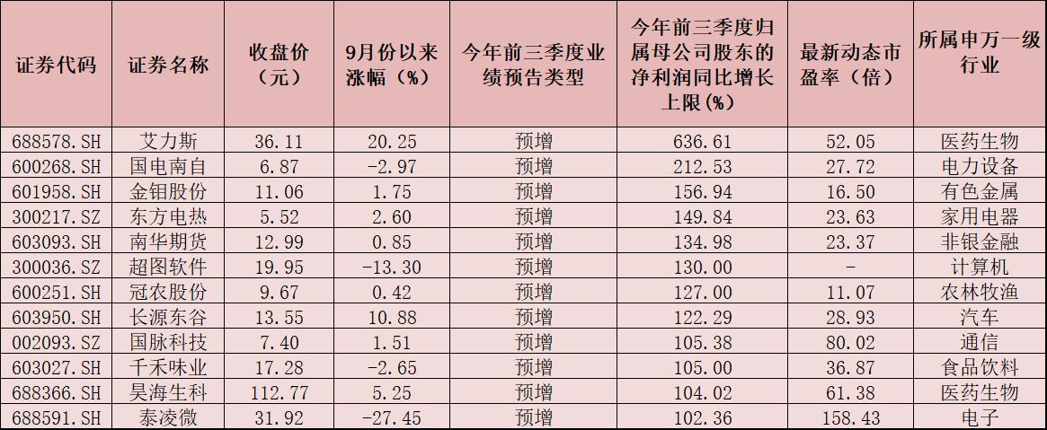 表:12家今年前三季度歸母凈利潤同比增幅上限預(yù)計超100%公司一覽