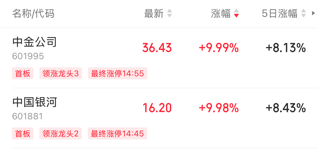值得注意的是,券商板塊異動(dòng)頻頻,今日漲幅達(dá)2.82%,板塊內(nèi)個(gè)股全部實(shí)現(xiàn)上漲。其中,中金公司、中國(guó)銀河A股雙雙漲停。截至記者發(fā)稿,兩家公司H股漲幅均超10%。此外,西部證券、信達(dá)證券A股漲幅也均超5%。