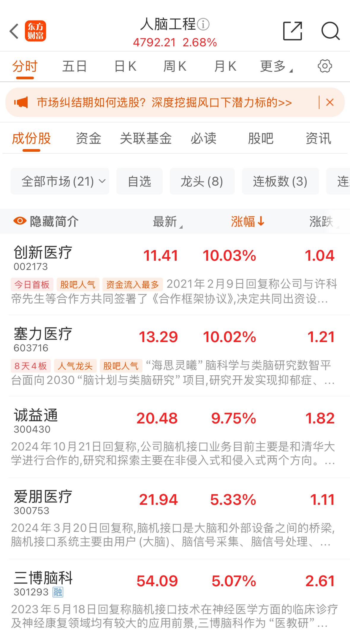3月12日午后,人腦工程概念股異動(dòng)拉升,截至當(dāng)日收盤,人腦工程概念股整體指數(shù)漲幅達(dá)2.68%,成份股中,創(chuàng)新醫(yī)療管理股份有限公司(簡(jiǎn)稱“創(chuàng)新醫(yī)療”)、塞力斯醫(yī)療科技集團(tuán)股份有限公司(簡(jiǎn)稱“塞力醫(yī)療”)兩只個(gè)股漲停,北京誠(chéng)益通控制技術(shù)集團(tuán)股份有限公司(簡(jiǎn)稱“誠(chéng)益通”)大漲9.75%,三博腦科醫(yī)院管理集團(tuán)股份有限公司(簡(jiǎn)稱“三博腦科”)、江蘇愛(ài)朋醫(yī)療科技股份有限公司(簡(jiǎn)稱“愛(ài)朋醫(yī)療”)漲超5%。
