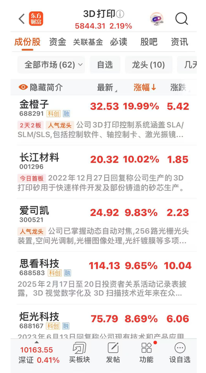 6月16日下午開盤后,3D打印概念板塊漲幅明顯擴(kuò)大。東方財(cái)富軟件顯示,截至收盤,3D打印概念股中金橙子(688291)“20cm”漲停,長江材料(001296)“10cm”漲停,愛司凱(300521)、思看科技(688583)、炬光科技(688167)、金運(yùn)激光(300220)等股漲超8%。