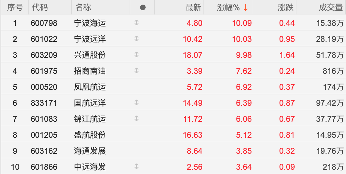 此外,今日航運(yùn)板塊集體飆漲。截至收盤,寧波海運(yùn)(600798)、寧波遠(yuǎn)洋(601022)、興通股份(603209)漲停,招商南油(601975)、鳳凰航運(yùn)(000520)、國航遠(yuǎn)洋(833171)等多股跟漲。其中國航遠(yuǎn)洋股價(jià)創(chuàng)歷史新高,一度漲超20%。