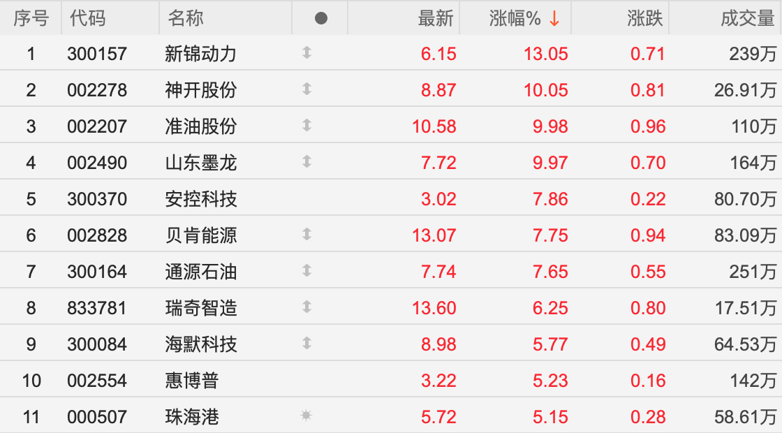 今日早盤,油氣板塊多股走高。截至收盤,山東墨龍(002490)、神開股份(002278)、準(zhǔn)油股份(002207)漲停,其中山東墨龍實(shí)現(xiàn)7連板。新錦動(dòng)力(300157)、安控科技(300370)、貝肯能源(002828)、通源石油(300164)等漲幅居前。