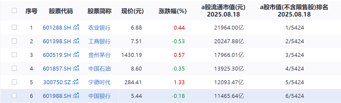 同花順iFind數(shù)據(jù)統(tǒng)計(jì)顯示,截至上午收盤時間,A股市值總和為114萬億元,突破100萬億元,創(chuàng)歷史新高,這也是A股市值歷史上首次突破100萬億元大關(guān)。具體來看,截至上午收盤時間,農(nóng)業(yè)銀行位居A股市值榜首位,約為2.20萬億元,工商銀行A股市值2.02萬億元位居次席。此外,貴州茅臺、中國石油、寧德時代、中國銀行等4股A股市值均超萬億元。