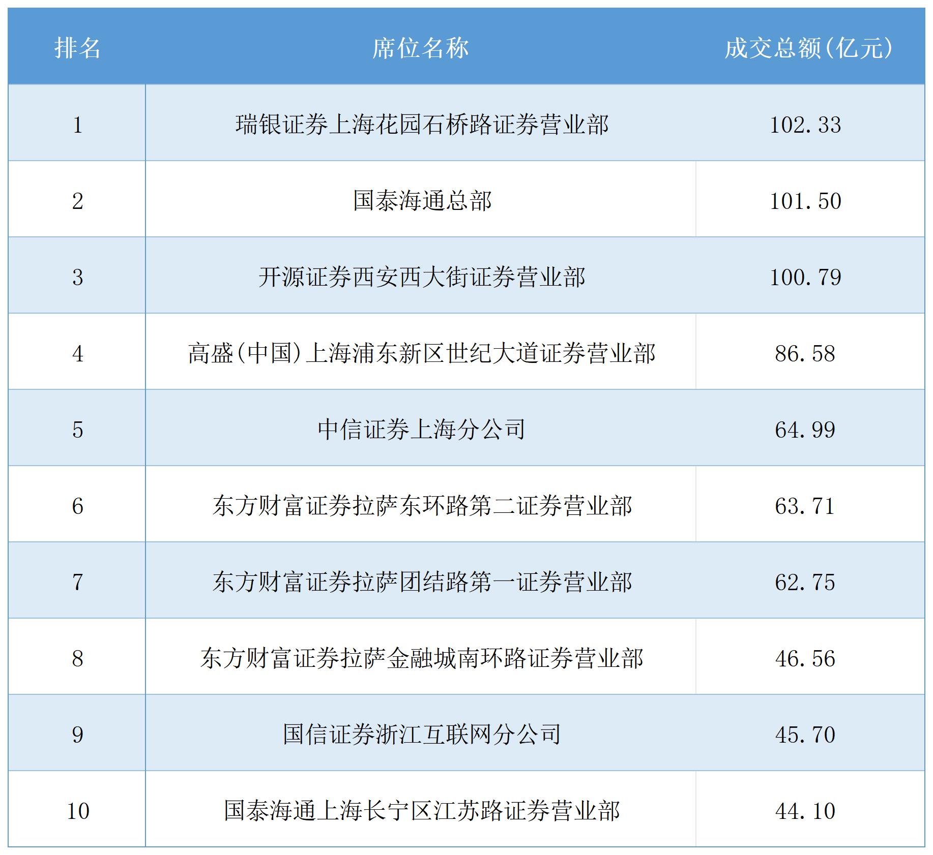 值得關(guān)注的是,近一個月,瑞銀證券上?;▓@石橋路證券營業(yè)部超越一眾老牌營業(yè)部,以102.33億元的成交金額位列券商龍虎榜榜首,該席位偏好電力、電源設(shè)備等題材;緊隨其后的是國泰海通總部和開源證券西安西大街證券營業(yè)部,成交金額分別為101.5億元、100.79億元。