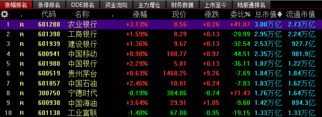 保險(xiǎn)、銀行等大金融板塊逆勢(shì)走強(qiáng)。農(nóng)業(yè)銀行開(kāi)盤(pán)后持續(xù)拉升,以超過(guò)3%的漲幅領(lǐng)漲銀行股,盤(pán)中股價(jià)再創(chuàng)歷史新高,截至午間收盤(pán),報(bào)8.56元/股,總市值達(dá)到3萬(wàn)億元,年內(nèi)累計(jì)漲幅超過(guò)67%。中國(guó)銀行、渝農(nóng)商行、工商銀行等跟漲,漲幅分別為2.29%、1.86%、1.59%。