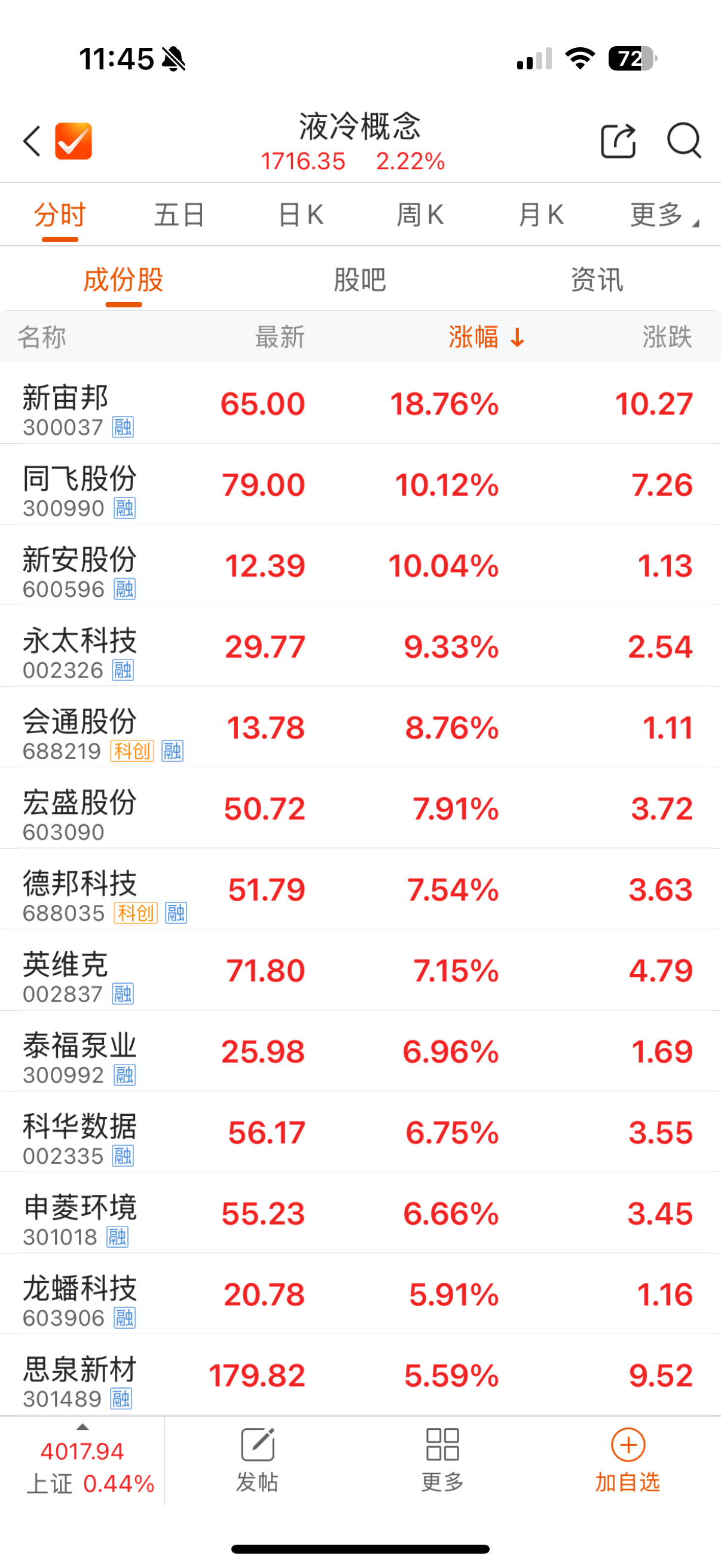 其中,新宙邦(300037)以18.76%的漲幅領漲,超頻三(300647)漲幅達14.10%,同飛股份(300990)漲超10%,新安股份(600596)漲停,英維克(002837)、申菱環(huán)境(301018)等產(chǎn)業(yè)鏈個股跟漲。