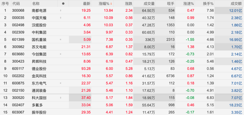 截至記者發(fā)稿,中國(guó)天楹(000035.SZ)、漢纜股份(002498.SZ)、中利集團(tuán)(002309.SZ)等多只儲(chǔ)能概念股強(qiáng)勢(shì)漲停,南都電源(300068.SZ)漲幅高達(dá)13.84%。此外,國(guó)機(jī)重裝(601399.SH)、蘇文電能(300982.SZ)、今創(chuàng)集團(tuán)(603680.SH)等個(gè)股也有不俗表現(xiàn),漲幅均超過(guò)6%。