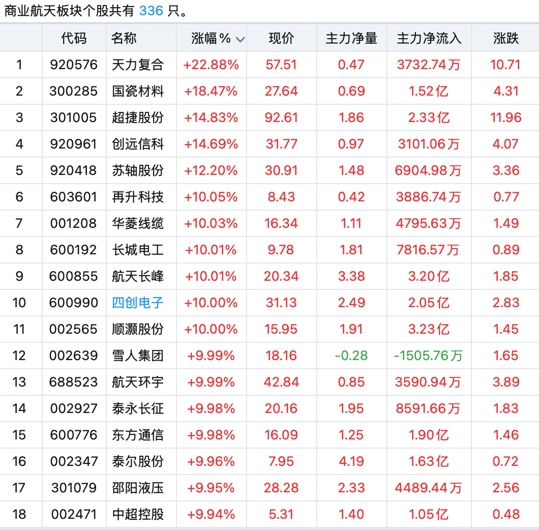此外,天力復(fù)合(920576)漲超20%,超捷股份(301005)、國瓷材料(300285)、創(chuàng)遠(yuǎn)信科(920961)、蘇軸股份(920418)股價上漲超10%。