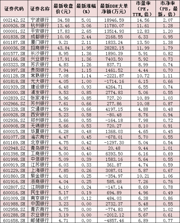 周二,在三大股指全線回落之際,隨著低估值的順周期股的走強,一直表現(xiàn)“平淡”的銀行板塊也暗流涌動,逆市上漲。截至收盤,板塊指數(shù)漲幅達1.29%。其中,寧波銀行、杭州銀行、平安銀行、成都銀行、廈門銀行等個股漲幅均超2%。