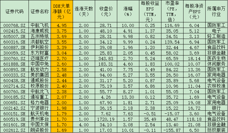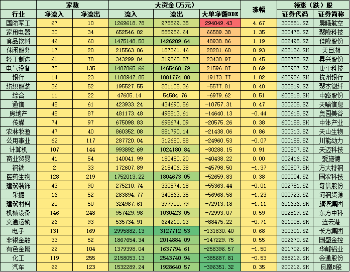 從資金層面看,今日A股大單資金整體凈流出143.75億元,占成交額1.86%,有1516只個(gè)股凈流入,2504只個(gè)股凈流出。有7類申萬一級(jí)行業(yè)呈現(xiàn)大單資金凈流入,國防軍工、家用電器、食品飲料等位居前三。