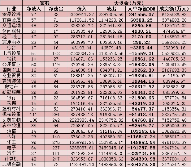 二、周三(12月16日)申萬一級行業(yè)大單資金流向