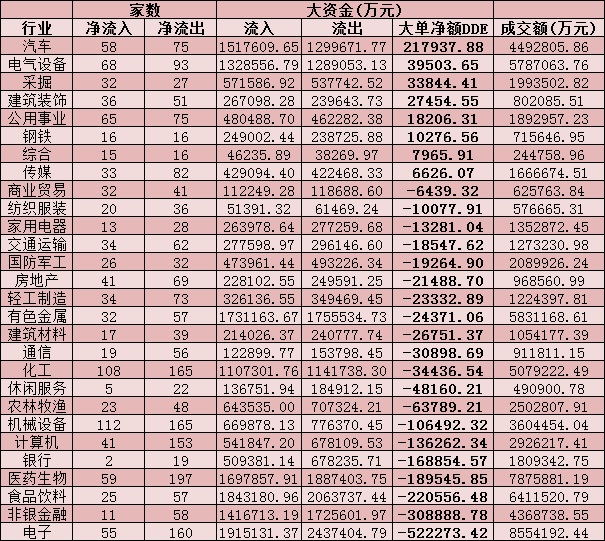 從資金層面看,今日A股大單資金整體凈流出163.19億元,其中,有1387只個股凈流入,2636只個股凈流出。從申萬一級的28個行業(yè)來看,有9個行業(yè)呈現(xiàn)大單資金凈流入態(tài)勢,其中,汽車行業(yè)資金凈流入居首,達21.79億元,緊隨其后的是電氣設(shè)備、采掘、建筑裝飾等三行業(yè),資金凈流入均超2億元。另外,電子、非銀金融、食品飲料等行業(yè)資金凈流出均超20億元。