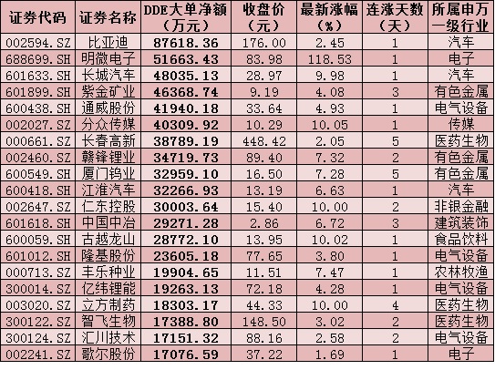 一、周五(12月18日)DDE大單資金凈買入TOP20