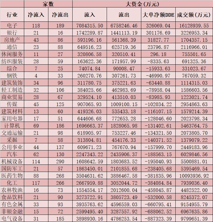 二、周一(1月11日)申萬一級行業(yè)大單資金流向
