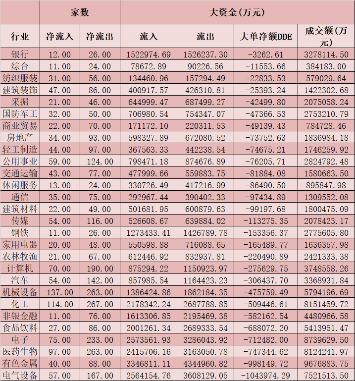 二、周四(3月4日)申萬(wàn)一級(jí)行業(yè)大單資金流向