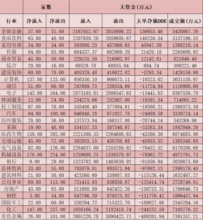 二、周五(3月5日)申萬一級(jí)行業(yè)大單資金流向