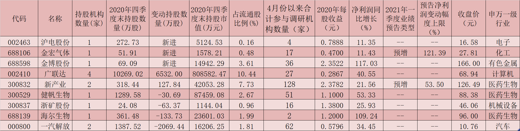 良好的業(yè)績表現(xiàn)或是近期機構頻繁調(diào)研的重要支撐。在上述4月份以來被機構調(diào)研的54家公司中,截至4月11日,已有50家公司披露了2020年年報業(yè)績,40家公司報告期內(nèi)實現(xiàn)凈利潤同比增長,占比八成。雙星新材、漢威科技、漢王科技、金博股份、海爾生物等5家公司報告期內(nèi)均實現(xiàn)凈利潤同比翻番。