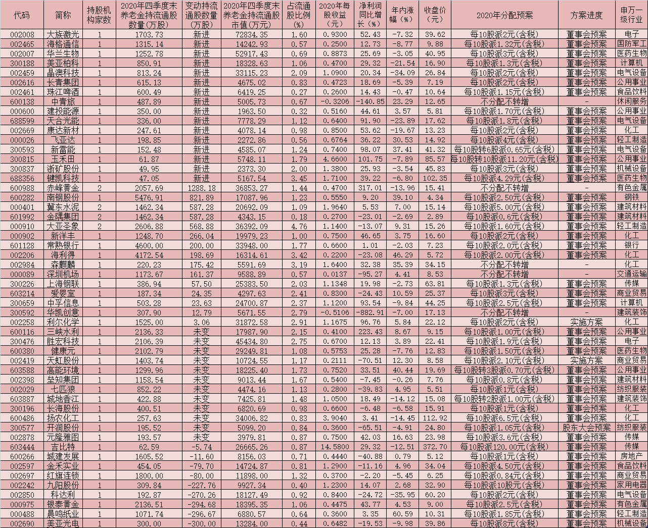 新進個股方面,截至去年四季度末,養(yǎng)老金新進持有16只個股,大族激光、海格通信、華蘭生物等3只個股在此期間養(yǎng)老金新進持股數(shù)量均超1000萬股,分別為1703.73萬股、1315.14萬股、1252.78萬股,美亞柏科、晶澳科技、長青集團、珠江啤酒等4只個股本期養(yǎng)老金新進持股數(shù)量也均逾500萬股。另外,中青旅、建投能源、天合光能、康達新材、飛亞達、新雷能、玉禾田、浙礦股份、鍵凱科技等9只個股本期也獲養(yǎng)老金的青睞。