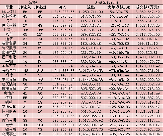 二、周二(4月13日)申萬一級(jí)行業(yè)大單資金流向