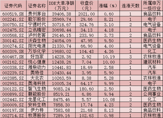 一、周二(4月13日)DDE大單資金凈買入TOP20