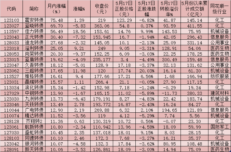 表:5月份以來累計漲幅超10%的可轉債一覽